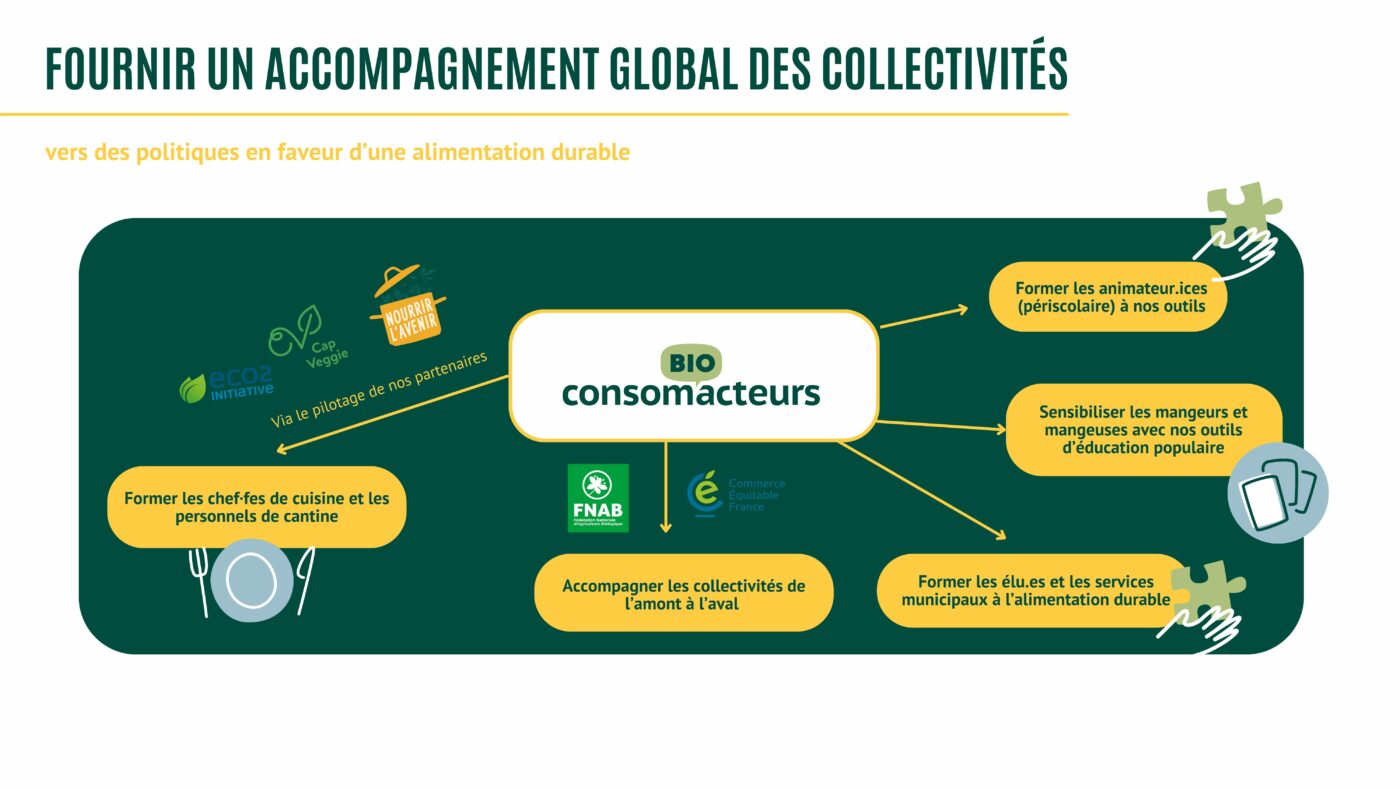 Nous accompagnons de manière globale et systémique les collectivités pour amorcer une transition vers un modèle agricole et alimentaire durable. Notre objectif : garantir l’accès à une alimentation biologique pour toutes et tous et offrir des outils pédagogiques pour sensibiliser et opérationaliser la transition agricole. Ce projet repose sur une coordination entre Bio Consom’acteurs et ces partenaires afin d’accompagner les collectivités vers du 100 % bio, de sensibiliser les mangeur·euses, de former les chef·fes cuisinier·es, technicien·nes et élu·es, et de réaliser des diagnostics pour accompagner la transition alimentaire et agricole.
