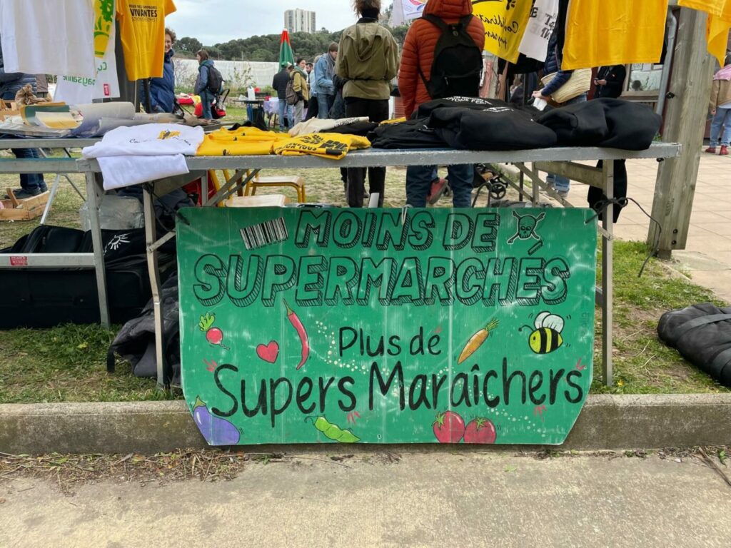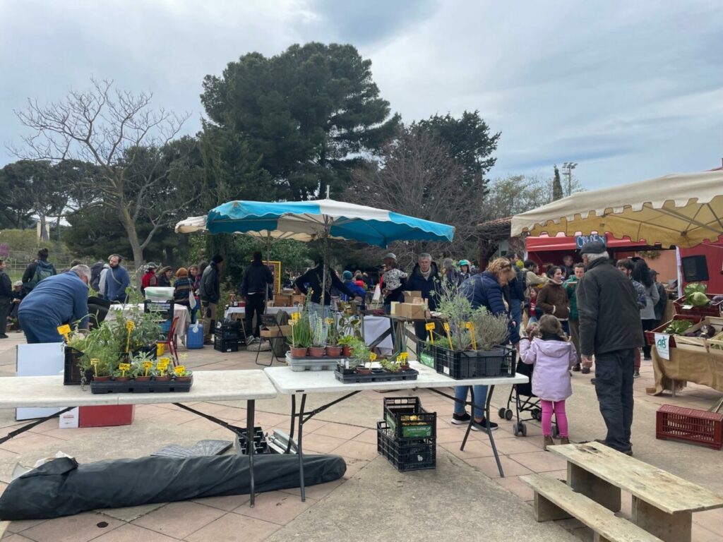 Samedi 29 mars dernier, la ferme accueillait la Journée de l’agriculture paysanne, une fête pensée à hauteur d’enfants et d’adultes… Le village associatif qui s’y tenait comprenait un marché de producteurs et productrices Bio de la région, des stands de miel ou encore de plantes aromatiques. Dans un second espace, des librairies indépendantes, comme Transit, étalaient leurs ouvrages sélectionnés en accord avec le lieu et le thème et nous avons également retrouvé les collectifs militants tels que Terre de liens, la Confédération paysanne 13, Attac, Paniers Solidaires Marseille… En somme, ce village réunissait les deux passions de Bio Consom’acteurs : l’agriculture Bio & le militantisme !