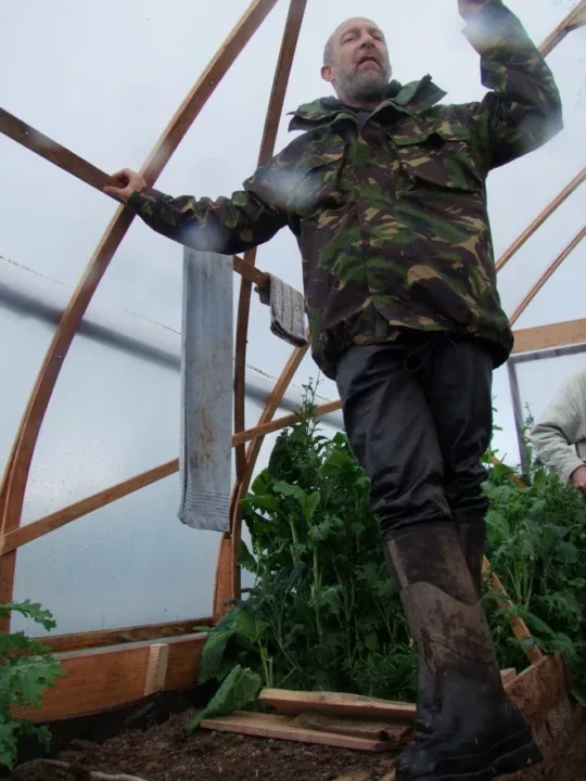 « Nous pouvons nourrir entre 50 et 100 personnes avec notre production », affirme Karl en nous faisant entrer dans une serre à l’armature en bois local, en forme de dôme parfait. « C’est un designer de Totnes qui l’a dessinée. Il en a bénéficié car il a plus de commandes depuis ! C’est un exemple de ce que nous cherchons à faire : soutenir l’économie locale au lieu d’acheter des serres en plastique venant de Chine…».