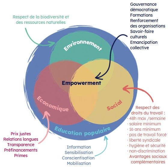 Un prix juste pour les producteurs et l’adhésion des consommateurs sont les deux leviers du commerce équitable pour atteindre la justice sociale et la protection des écosystèmes. La mise en place d’une filière de commerce équitable se traduit par l’instauration d’un partenariat entre un acheteur (une entreprise) et des organisations de producteurs (paysans ou artisans en général). A cette occasion, un ensemble de règles sont fixées, qui précise les engagements de chacune des parties.