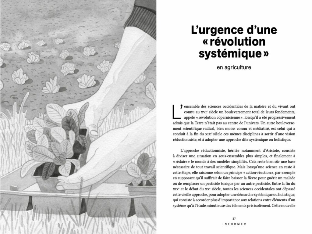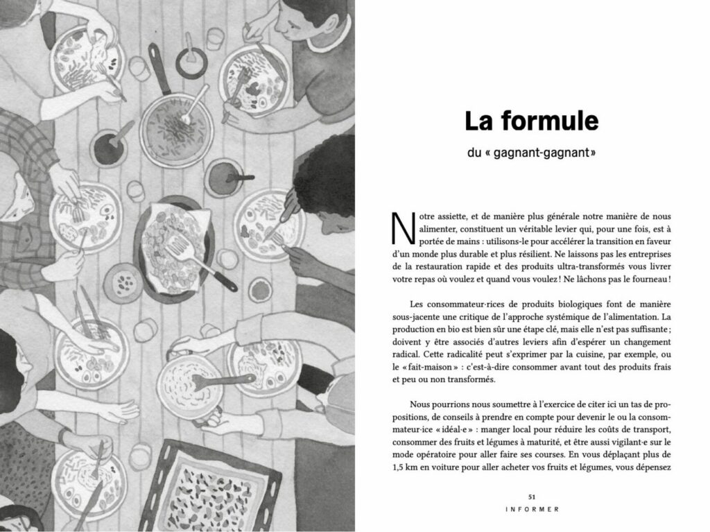 Il y a une phrase commune, autour de laquelle s’articulent les textes des auteur.ices, et qui guide l’ouvrage : « Quelle(s) forme(s) peut prendre la défense d’une agriculture et d’une alimentation saines et durables ? ». Cette question posée aux contributeur·ices est suffisamment large pour qu’ils et elles laissent libre court à leurs imaginaires respectifs, à leurs structures, à leurs désirs. La défense de l’agriculture et de l’alimentation juste pour toutes et tous puise sa puissance dans sa pluralité. Ainsi, certain·es misent sur l’éducation, populaire ou non, d’autres sur la communication, d’autres sur l’art, d’autres encore sur un commerce alternatif, d’autres sur les actions individuelles, d’autres sur les recours en justice et autres plaidoyers.