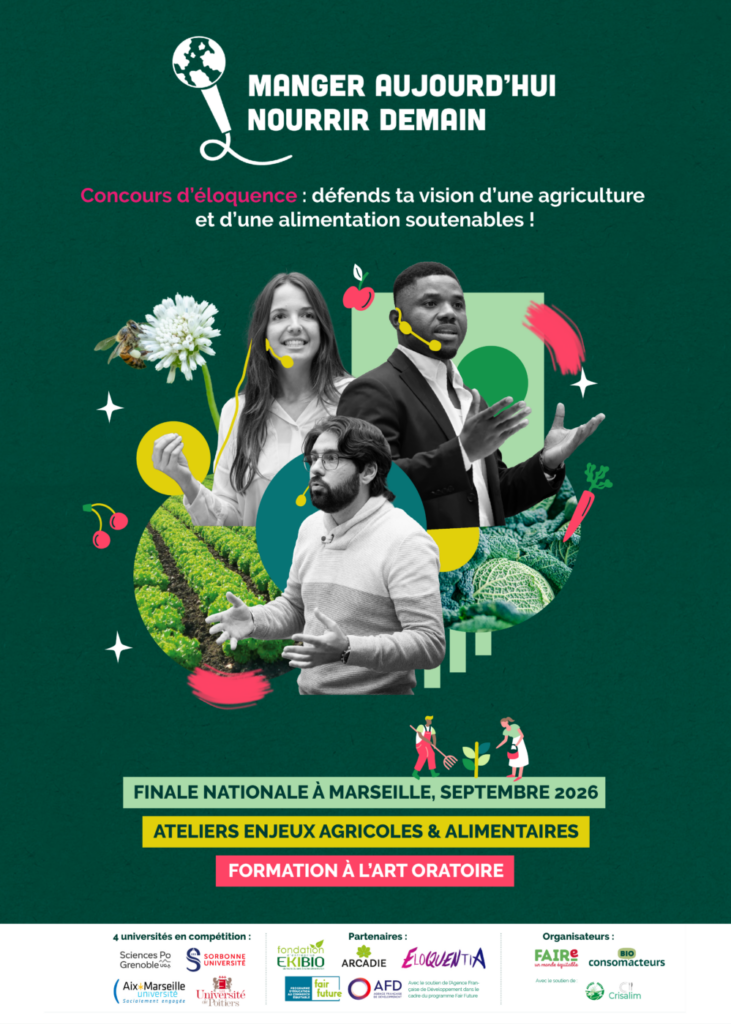 Lancé en 2023 par Bio Consom’acteurs, FAIRe un monde équitable et Max Havelaar France, le concours d’éloquence « Manger aujourd’hui, nourrir demain » offre aux étudiant·es de toute la France un espace unique pour exprimer leurs visions d’une agriculture et d’une alimentation durables.