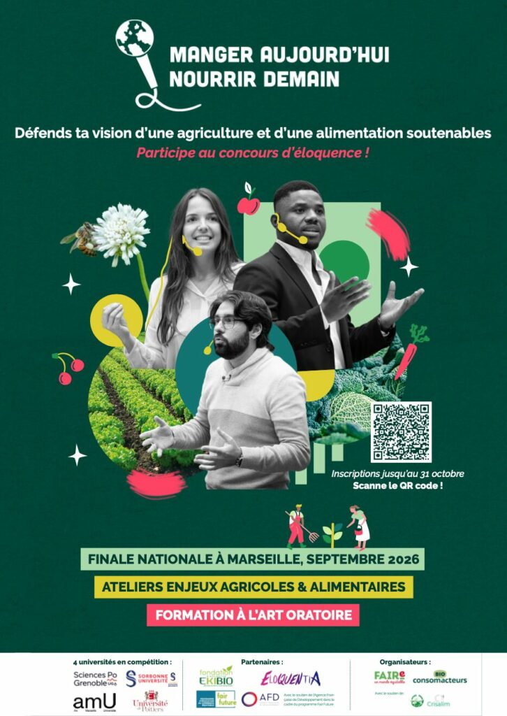 Forte du succès et de l’énergie de la première édition, une deuxième édition du concours d’éloquence « Manger aujourd’hui, nourrir demain » est lancée ! L’objectif reste le même : donner la parole aux étudiant·es sur les enjeux agricoles, alimentaires et climatiques, tout en allant plus loin dans l’engagement citoyen et politique. Cette nouvelle édition s’inscrit dans la perspective des élections municipales de 2026. Elle a pour ambition de permettre aux jeunes de porter directement leurs idées auprès des candidat·es et élu·es locaux, en complément du travail oratoire.